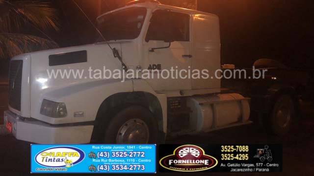 Por volta das 20:30,do ultimo dia 09/04, a equipe da Policia Rodoviária Estadual recebeu uma ligação do gerente do posto Cristo Rei informando que no patio do referido posto havia um caminhão que estaria com placas que não estavam condizendo com o veiculo, diante do fato a equipe manteve com ele e foram em direção ao posto onde cruzaram com o referido caminhão próximo ao km 272 da PR 092, onde foi abordado e constatado que se tratava de produto de furto pois os lacres estavam rompidos e o chassi não condizia com as placas, indagado o motorista o mesmo nos respondeu que havia saído de Camboriú, SC e iria ate campo grande Mato Grosso, e que deixaria o caminhão no posto de combustível Locatelli.