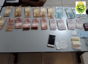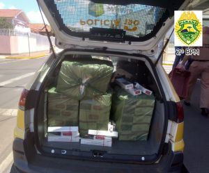 Policiais Militares receberam uma denúncia relatando que um determinado indivíduo estaria vindo do município de Ribeirão Claro, num veículo VW/Gol, de cor branca, carregado de cigarros contrabandeados; foi deflagrada a ação policial para abordar os suspeitos, sendo localizado o citado veículo transitando pela PR 431, nas proximidades da entrada do Bairro Sete Voltas, sentido Jacarezinho; o carro foi abordado nas proximidades do Incubatório da JBS, PR 431, Bairro Ouro Grande; o ocupantes foram identificados ; com o condutor (25 anos) foi encontrado uma porção de maconha (bolso do shorts) e mais um cigarro da mesma droga dentro do veículo (condutor assumiu que estava consumindo); com passageiro (35 anos) foi encontrado a quantia expressiva de *R$ 12.710,00, dispostas em notas de R$ 100, 50, 20, 10 e 5; quanto aos cigarros nada foi localizado no veículo, contudo, afirmaram que já haviam entregue os cigarros num mercado em Ribeirão Claro; as equipes fizeram contato com o responsável do mercado (22 anos), o qual confirmou ter feito a compra dos cigarros do abordado que estava com o dinheiro, no valor estimado de R$ 3.800,00, que entregou a equipe o produto da compra, vários pacotes de cigarros da marca Palermo e Eight que totalizaram 2.083 maços; os dois indivíduos abordados foram presos por contrabando e o responsável pelo mercado preso por receptação.
