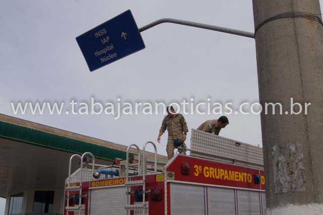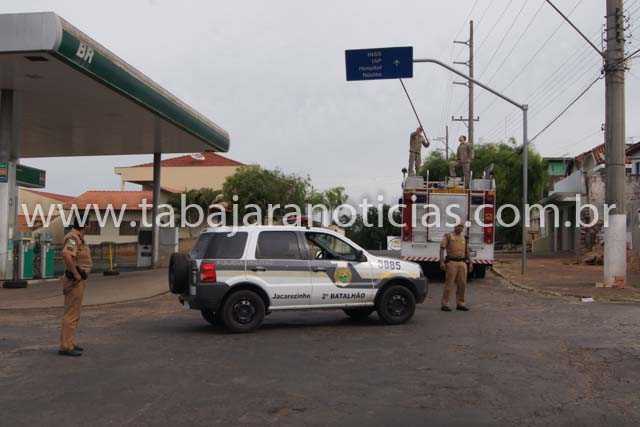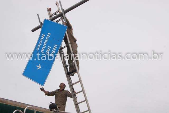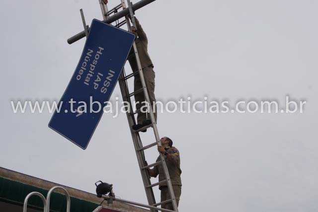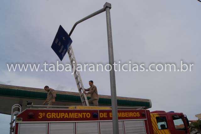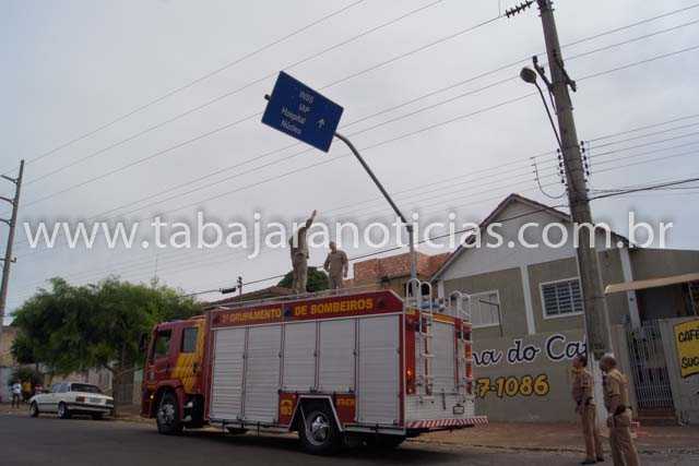POLICIAIS MILITARES E BOMBEIROS RETIRAM PLACA DE SINALIZAÇÃO PARA EVITAR ACIDENTE