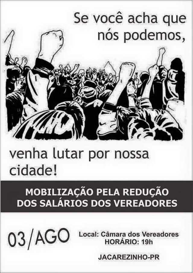 Evento no Facebook convida a população Jacarezinhense a se mobilizar pela redução do salário dos vereadores no dia 03 de agosto às 19 horas na câmara Municipal da cidade.