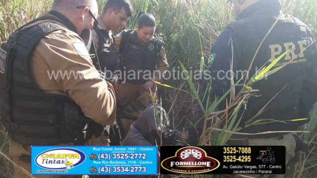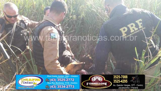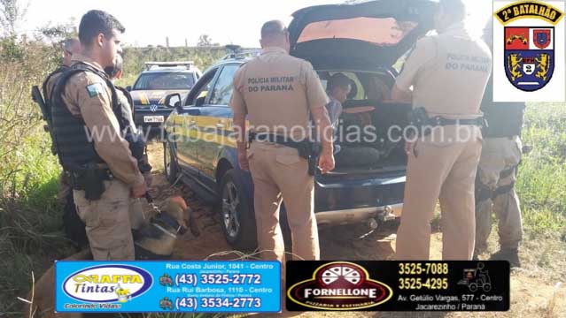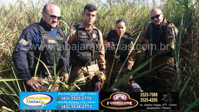 Na manhã deste domingo 08, por volta das 10h35, Policiais Rodoviários Federais na Operação Égide Corredor SP, em fiscalização no Km 01 da BR-369, município de Jacarezinho/PR, na divisa dos estados de SP e PR, deram sinal de parada ao veículo Hyundai/HB20 que ostentava as placas FWF-8607 de São Paulo/SP, ocupado apenas pelo condutor, que empreendeu fuga, tendo sido prontamente acompanhado pelas viaturas da PRF. O fugitivo acessou a BR153 e, cerca de 1 Km depois, parou o veículo na faixa da esquerda e empreendeu fuga a pé, atravessando o sentido contrário da pista, e adentrando a mata. As equipes da PRF iniciaram as buscas ao fugitivo, contando com o apoio do Águia da PM/SP e o cão farejador da PM/PR. Ás 15 horas, a partir de um boné deixado no veículo, o cão farejador localizou, escondido no meio da mata, o indivíduo sem documentos, que se identificou como Guilherme Martins Ribeiro, de 23 anos, e admitiu que pegara o veículo carregado em Mundo Novo/MS, levaria até Taubaté/SP e pelo transporte receberia 15 mil reais.