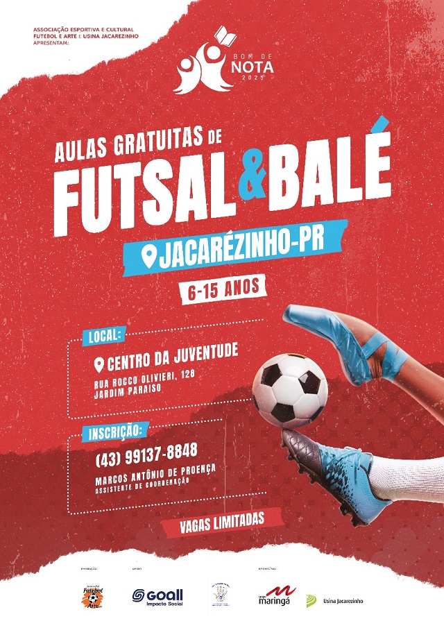 Com o objetivo de promover o acesso à cultura, ao esporte e ao desenvolvimento social de crianças e adolescentes, o projeto Bom de Nota Jacarezinho 2025 está em pleno funcionamento na cidade de Jacarezinho (PR). A iniciativa é realizada pela Associação Esportiva e Cultural Futebol e Arte, com patrocínio do Grupo Maringá, e oferece gratuitamente aulas de futsal e balé para 100 alunos da rede pública de ensino, com idades entre 7 e 14 anos.