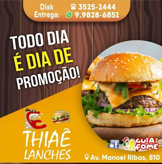 Promoção de sábado na Thiaê Lanches, X salada com catupiri, X burguer com cheddar, X fominha, X salada queijo egg, cachorro quente egg e X salada salsicha qualquer um por R$ 10,00, isso mesmo qualquer um destes lanches poe apenas dez reais, promoção assim você só encontra na Thiaê Lanches.