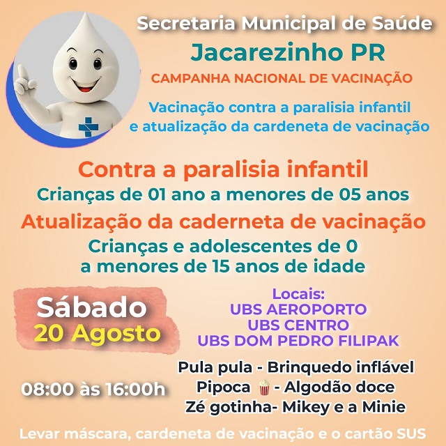 A secretaria Municipal de Saúde de Jacarezinho realiza nesta sábado a campanha nacional de vacinação, serão aplicadas a vacina contra a paralisia infantil entre outras, além da atualização da carteira de vacinação colocando em dia as vacinas atrasadas.