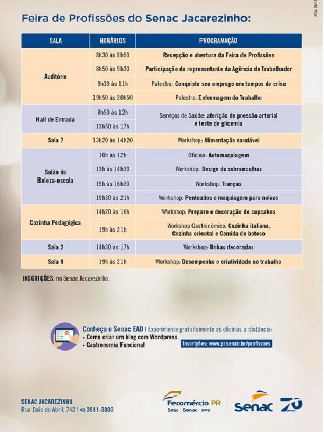 No Senac Jacarezinho, o público poderá assistir a palestra tema da Feira, Conquiste seu emprego em tempos de crise, às 9h30. Haverá também workshops de gastronomia e beleza, serviços de saúde como aferição de pressão e teste de glicemia, entre outras atividades. A programação completa pode ser conferida no site www.pr.senac.br/profissoes. Inscrições no local da Feira.