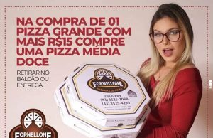 Agora na Fornellone na compra de qualquer pizza grande, com mais 15 reais você leva uma pizza uma média doce, de banana ou chocolate.