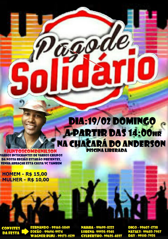 O Pagode Solidário será no dia 19 de Fevereiro a partir da 14 horas na Chácara do Anderson, (chácara Paraíso) na rua Paulo Rodrigues da silva 253 Bairro Aeroporto, com piscina liberada, vários grupos de nossa região estarão presentes, durante a festa será realizado o sorteio de um ensaio fotográfico.