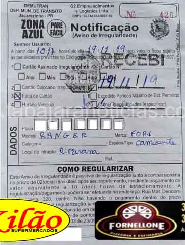 Um representante comercial esteve nesta semana em Jacarezinho e segundo ele parou seu carro no centro, ainda segundo ele a agente da zona azul atravessou a rua para o lado contrário ao que ele teria estacionado, após um tempo de espera por um dos agente atende-lo sem sucesso, ele então entrou em uma loja, ao sair encontrou no para brizas de seu carro uma multa.